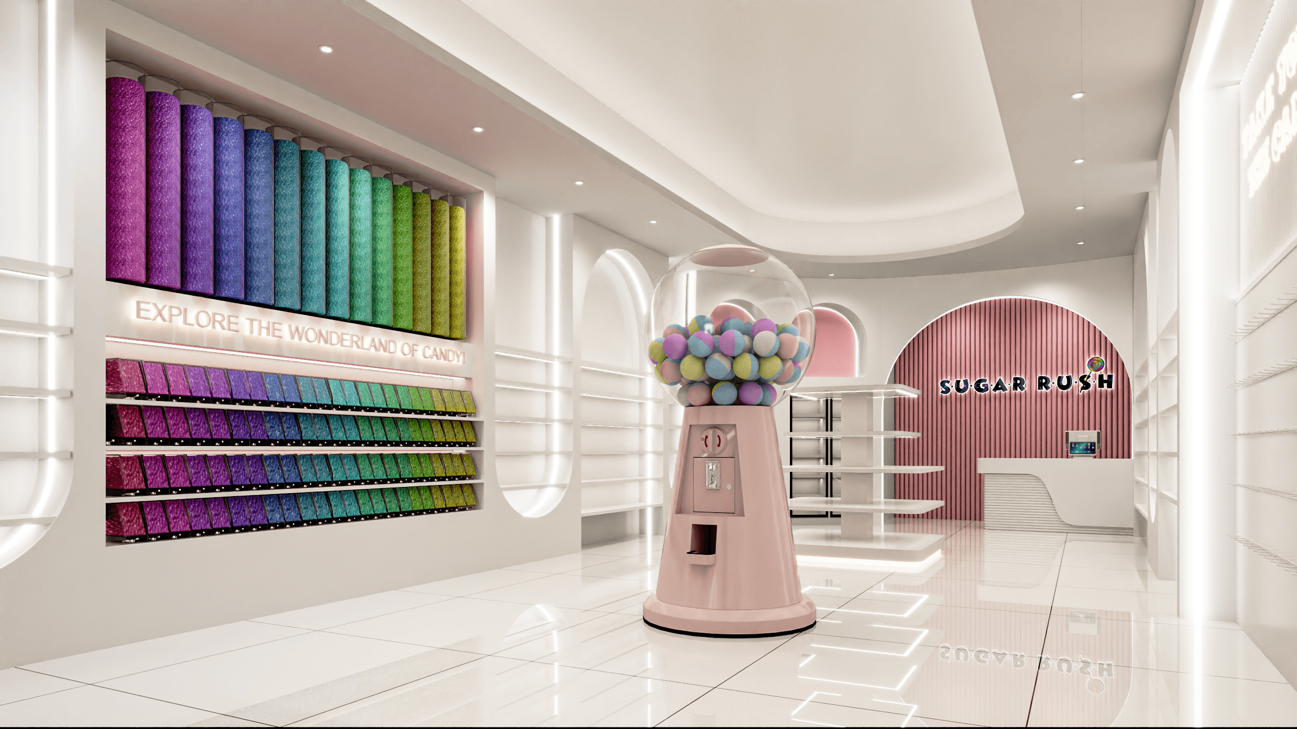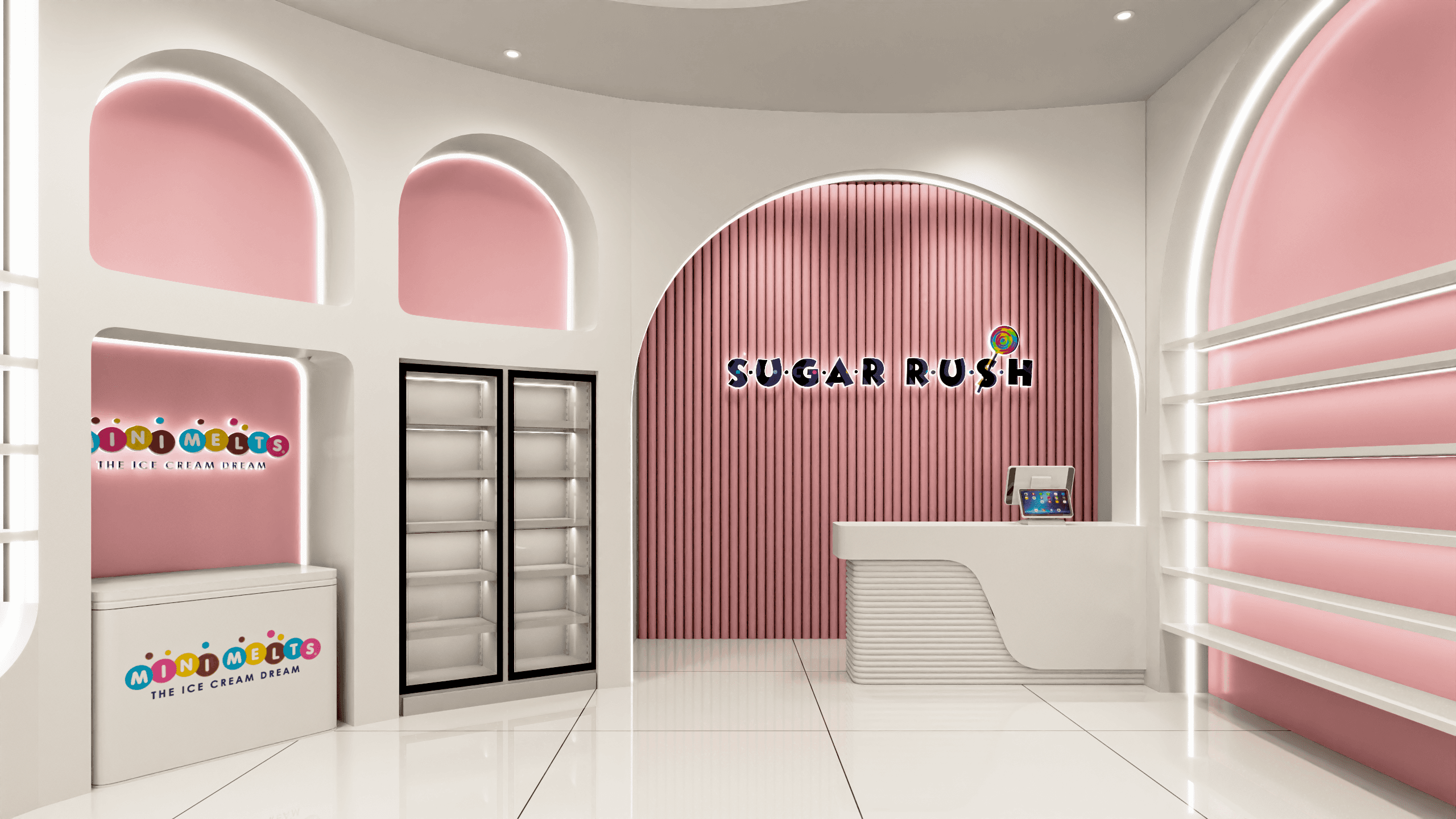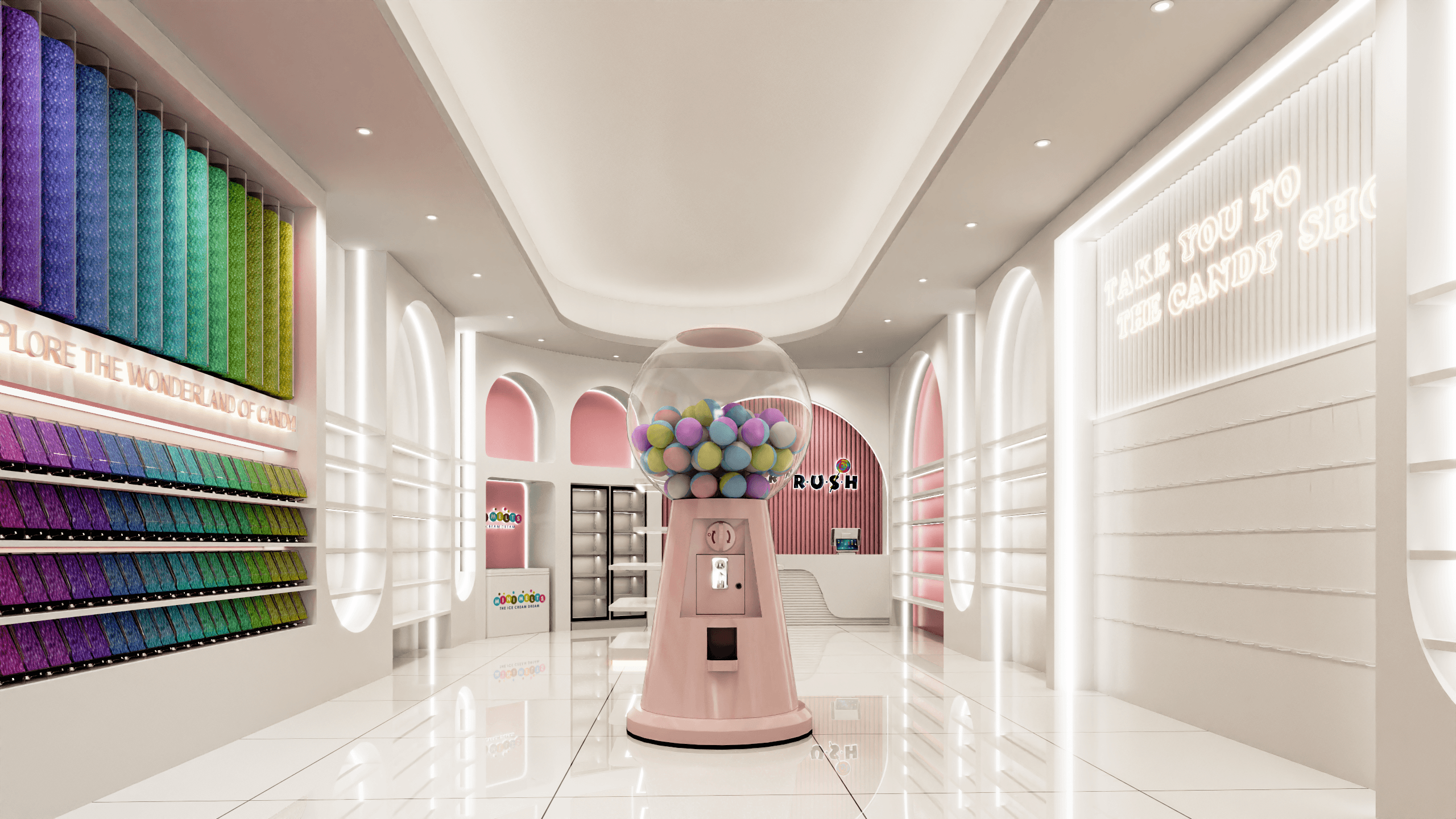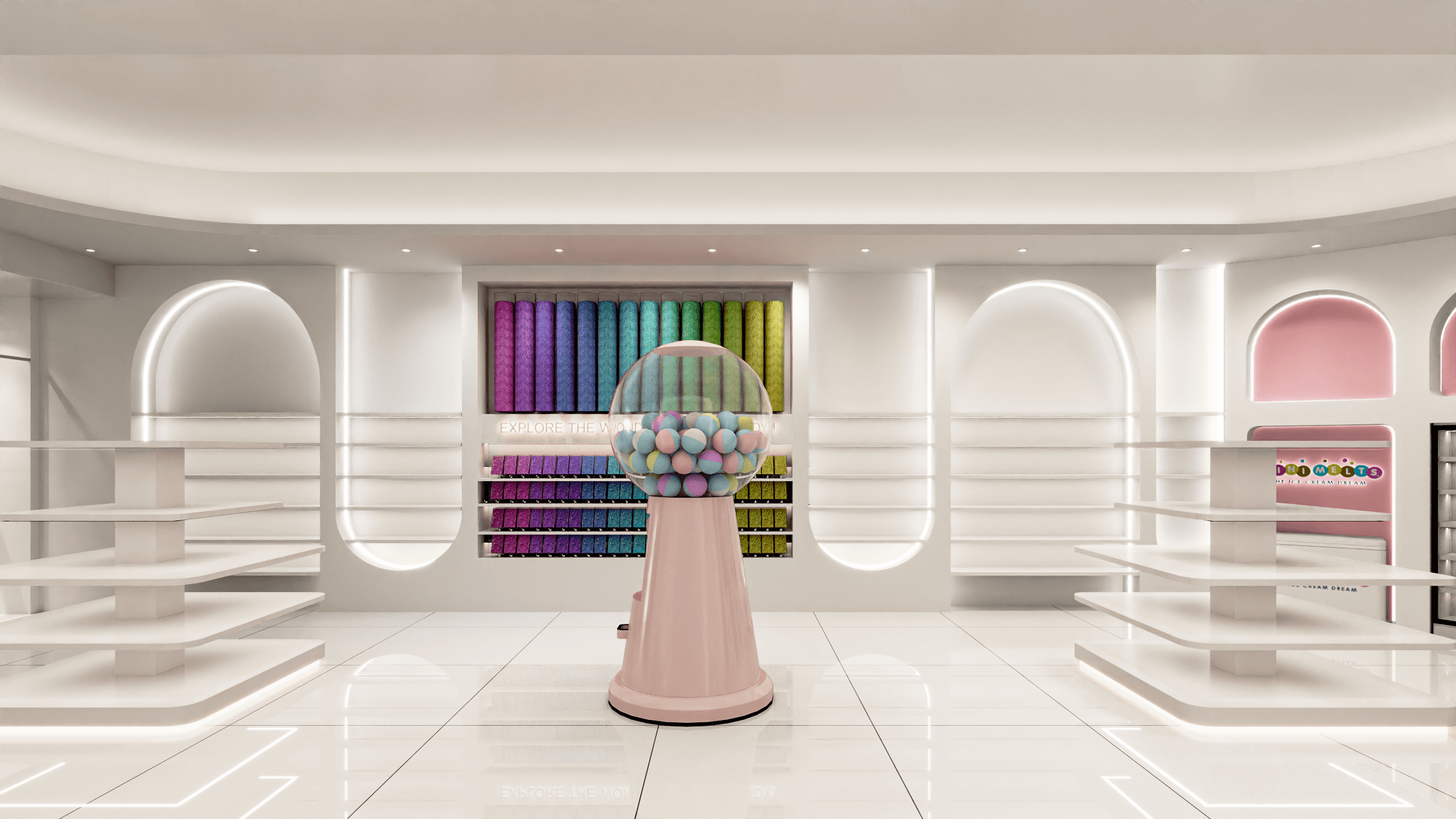 A 2,000 sq ft candy shop in Oshawa designed to feel playful and full of life. Soft curves and arched elements shape the space throughout, while a lighting-focused approach transforms the overall mood—creating a bright, welcoming environment that feels cute, energetic, and photo-ready.