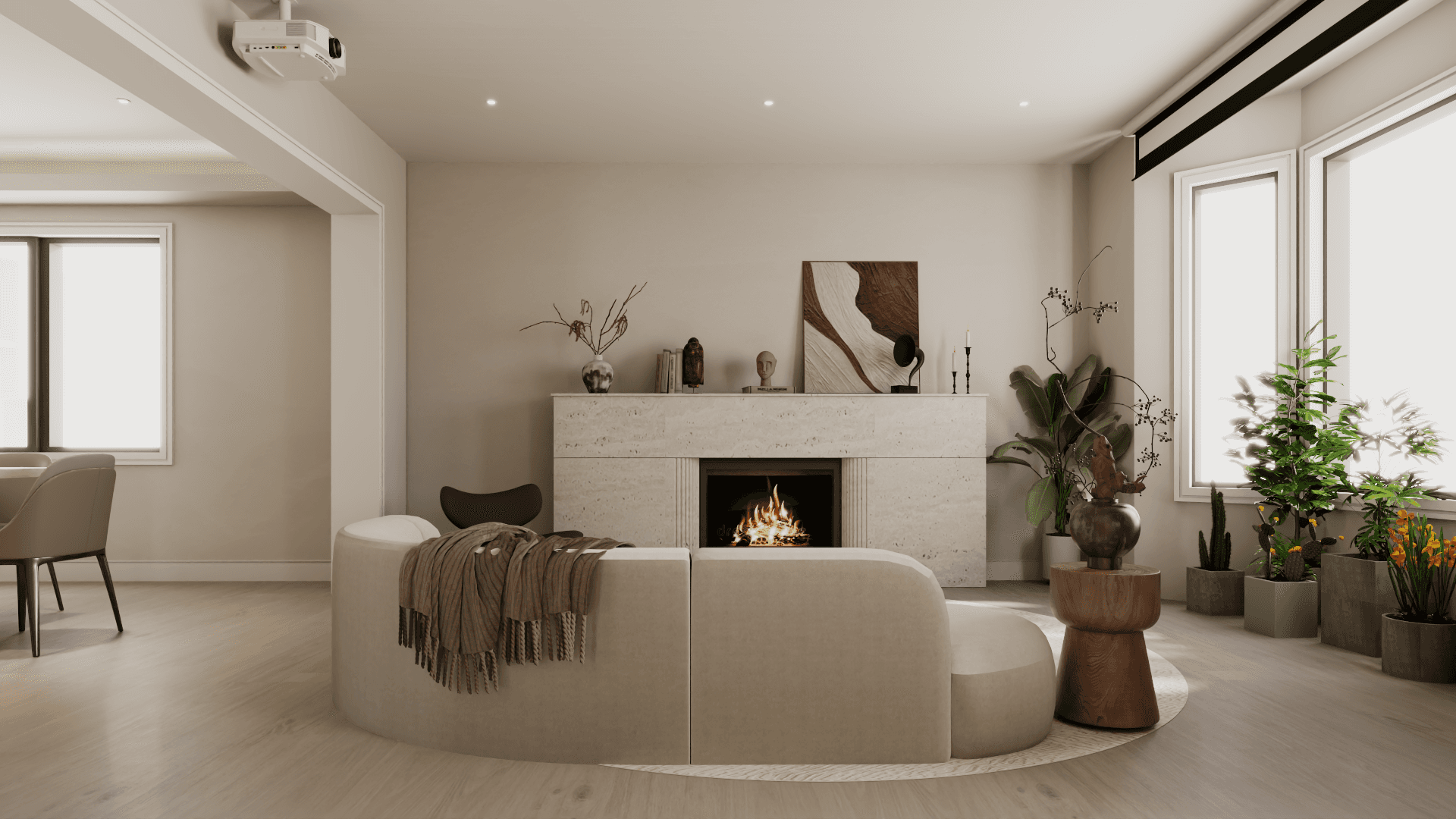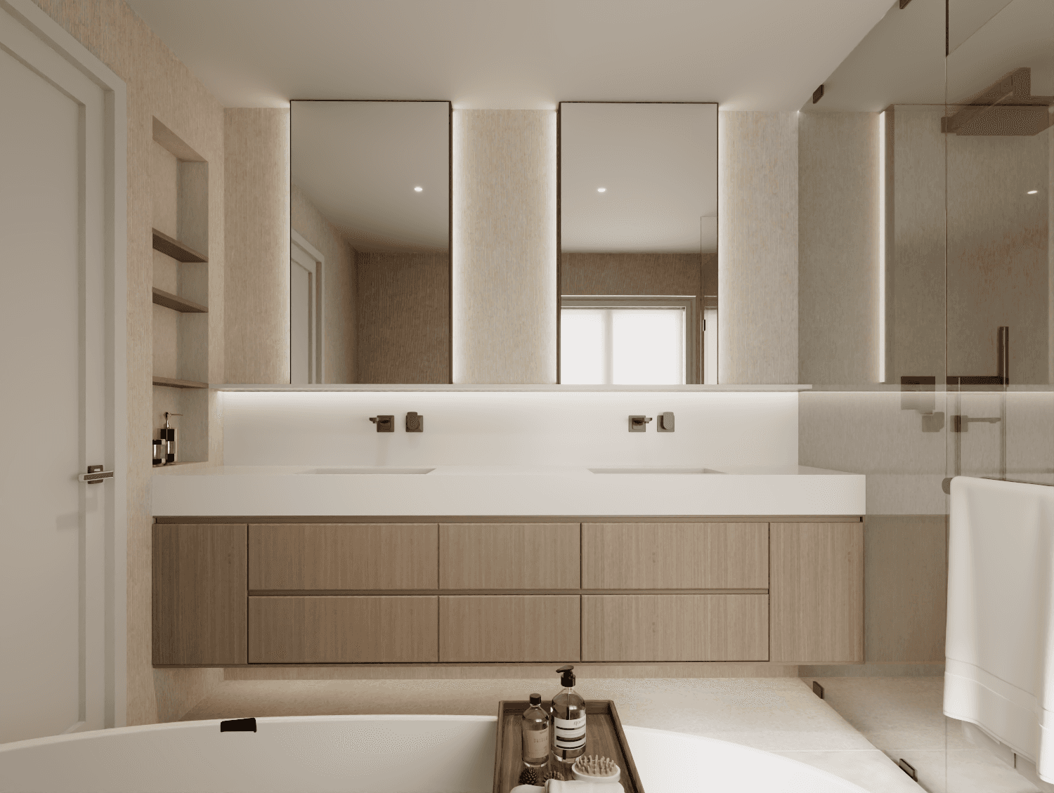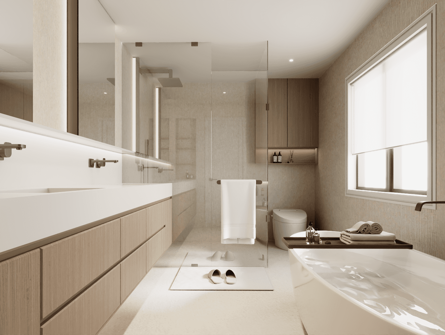 Traditional at its core with a modern refinement, layered in natural white oak, travertine, and Taj Mahal stone for a calm, organic warmth.
